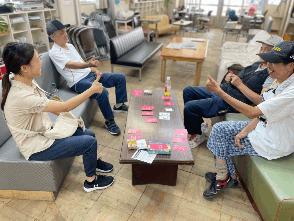 利用者さんとの交流ではお話ししたり、カードゲームをしたりなどをして利用者さんがリラックスして過ごせるようにサポートしてもらいます。